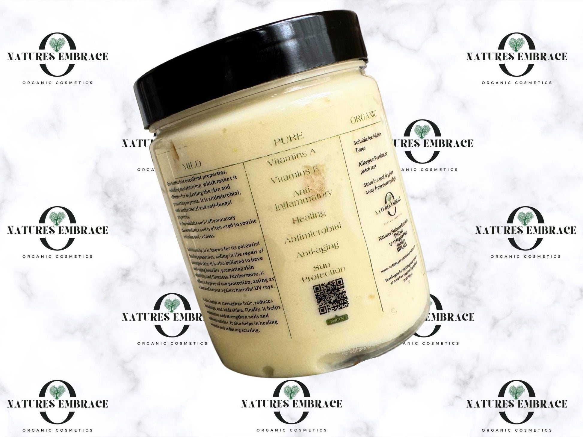 Natures Embrace Organic Whipped Unrefined Shea Butter, Cocoa Butter , Olive Oil, Castor Oil, Coconut Oil, Vitamin E Mixed Butter, Full tracebility on origins off all our products. Made in small batches in London, UK